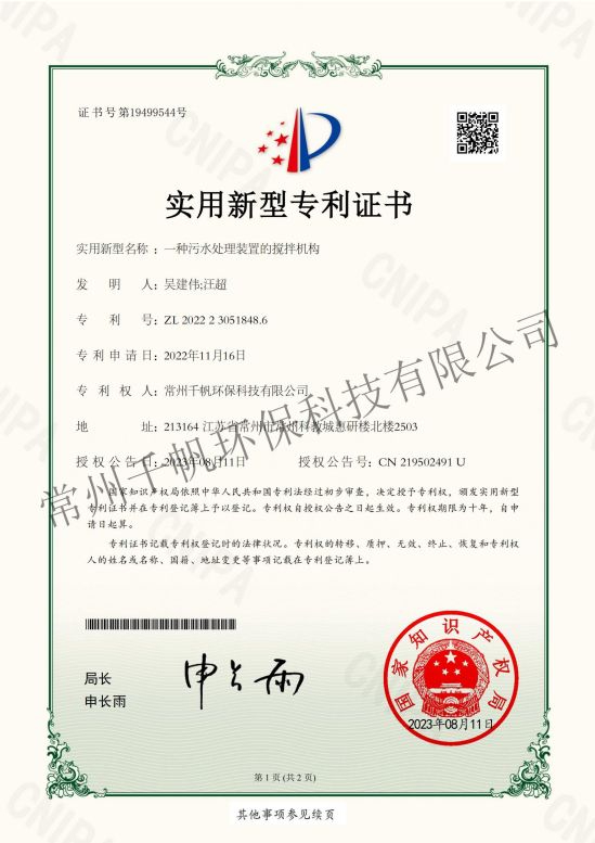 實(shí)用新型專利證書(shū) 一種污水處理裝置的攪拌機(jī)構(gòu)